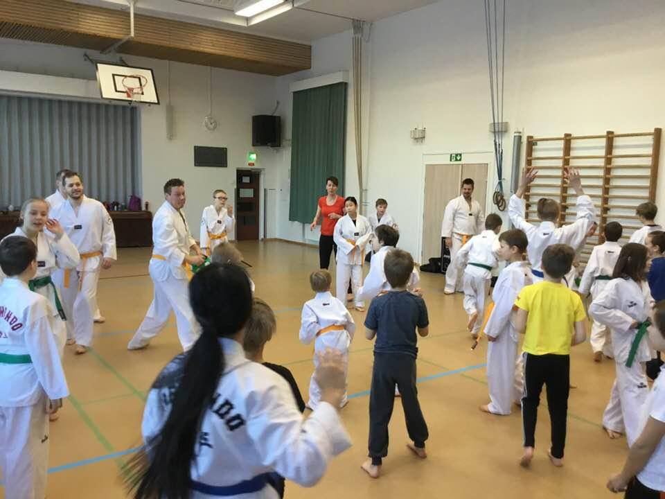 Taekwondon lajiesittely 11.1.2018 Kangasalan Huutijärven ja Kirkkoharjun koulujen 1-6 luokkien noin 350 oppilaalle ja yli 10 opettajalle. Lisäksi pidettiin kaikille venyttelyä, lihaskuntoa ja koordinaatioharjoitteita sekä itsepuolustuksen perusteita. Muistutettiin, että kamppailIja EI kiusaa ja kaikkia kunnioitetaan ja kohdellaan hyvin. Lasten itsepuolustuksena keskusteltiin epärehellisistä aikuisista ja heistä selviytymisestä.