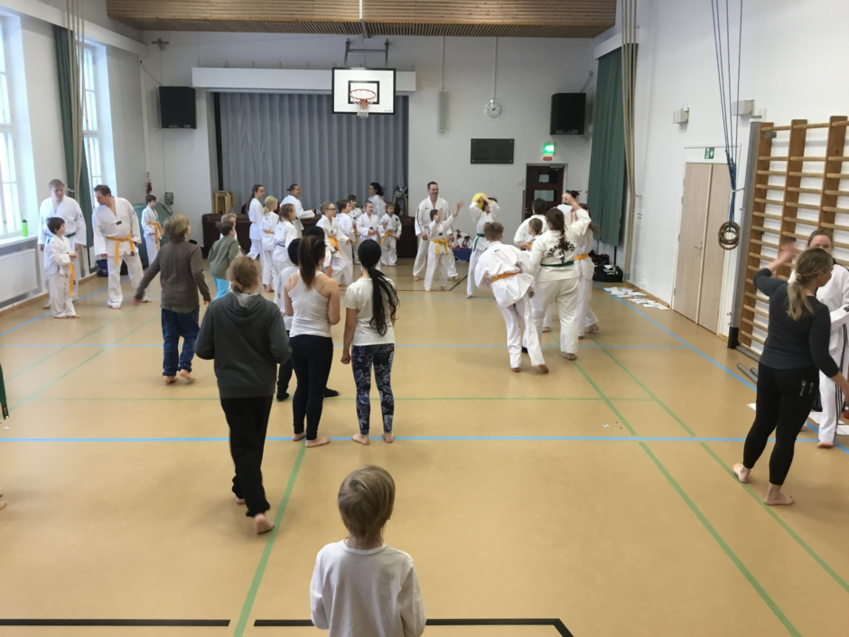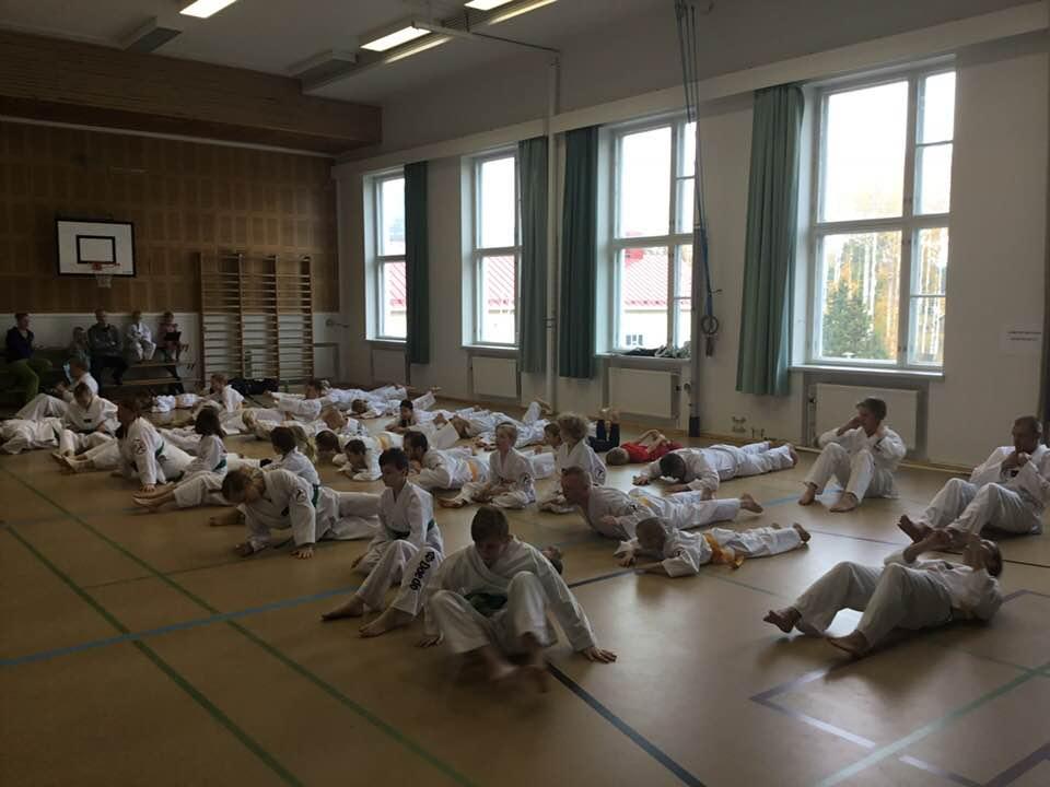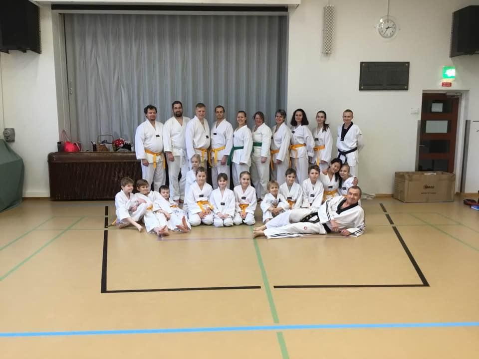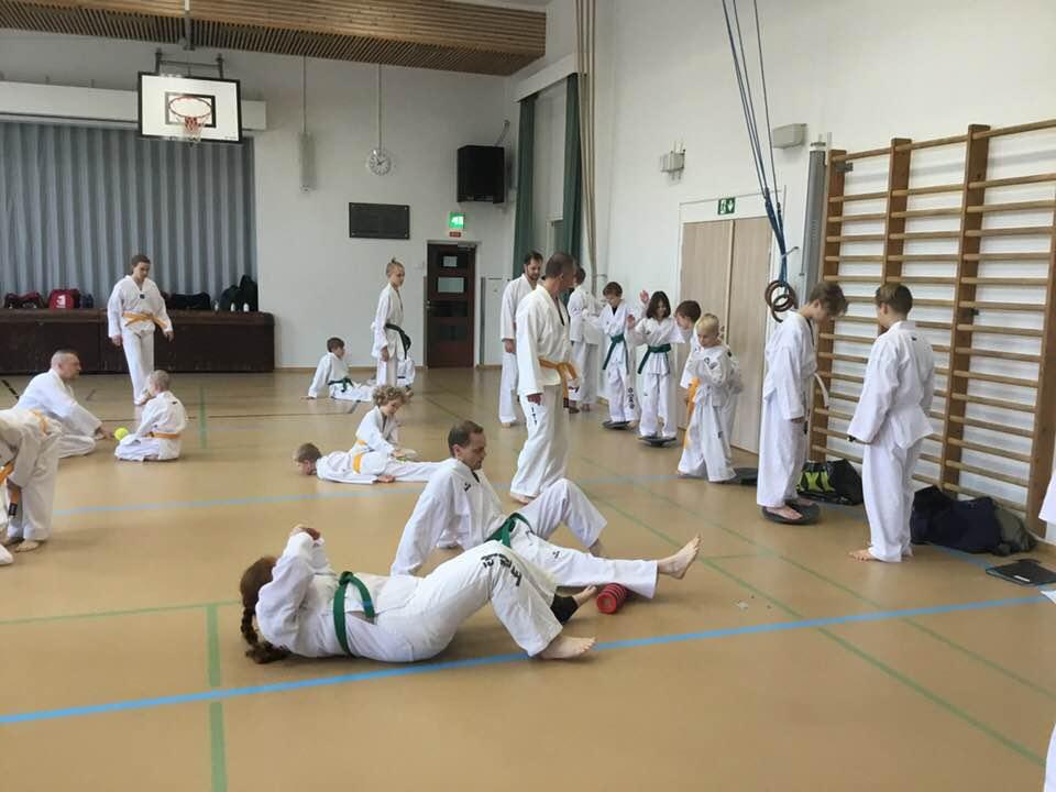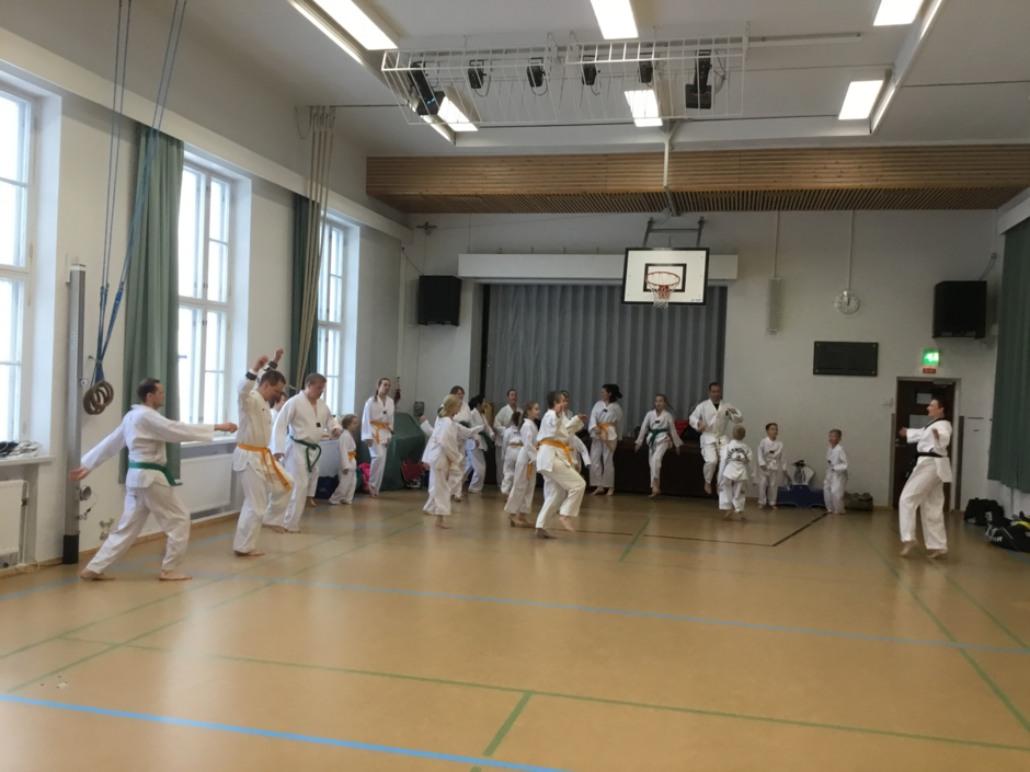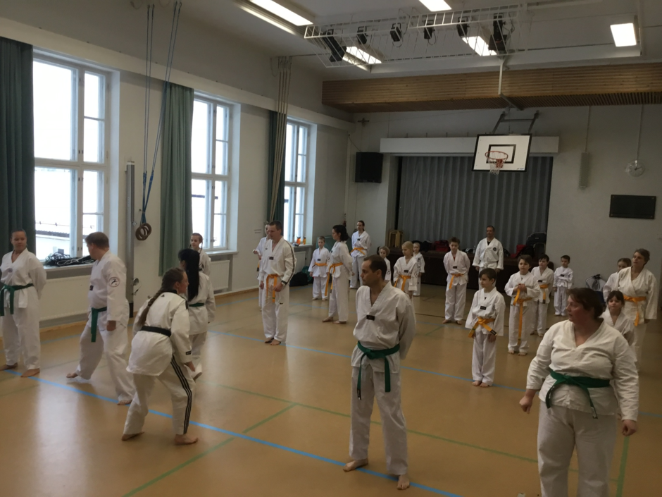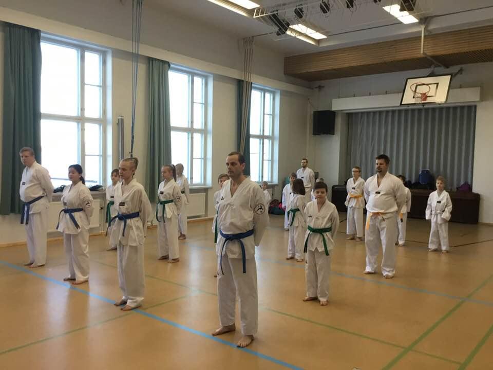 Jatkokurssilaisia ohjaajineen 4.11.2017, jolloin suoritettiin myös lasten harjoitusvyökoe aiheena taitopotkut ja -lyönnit.