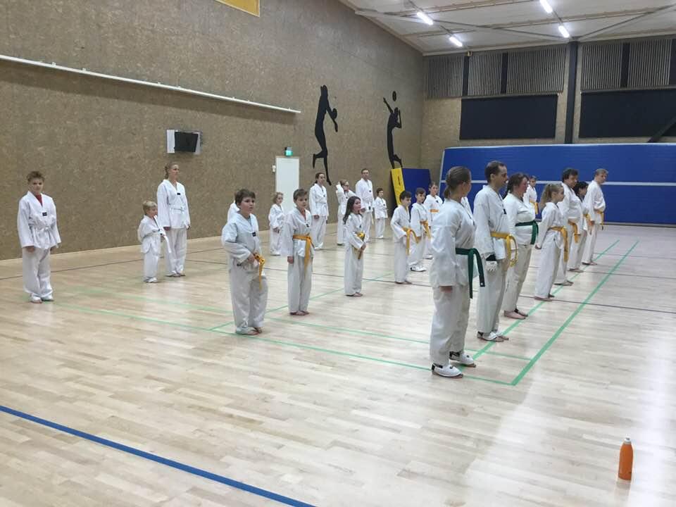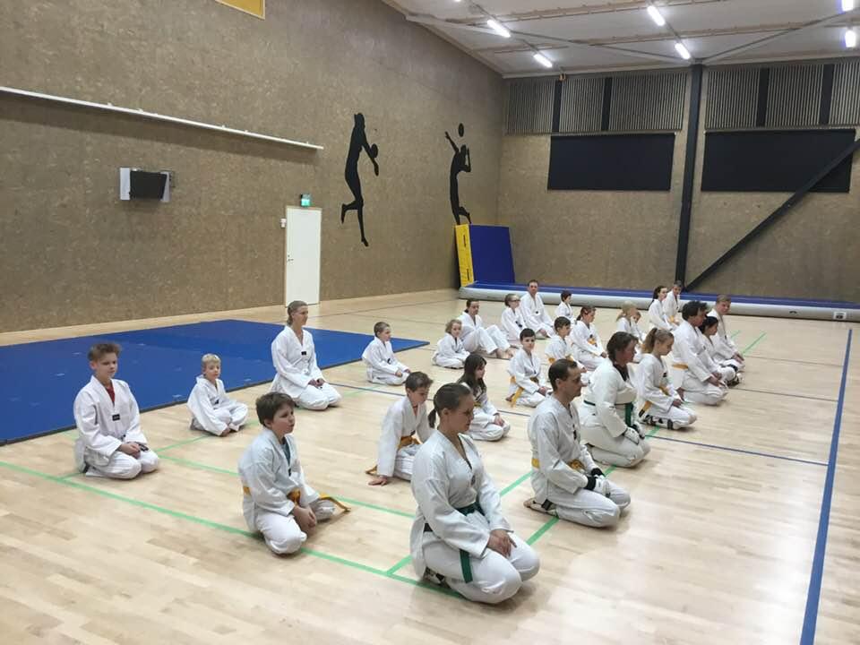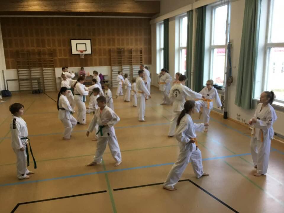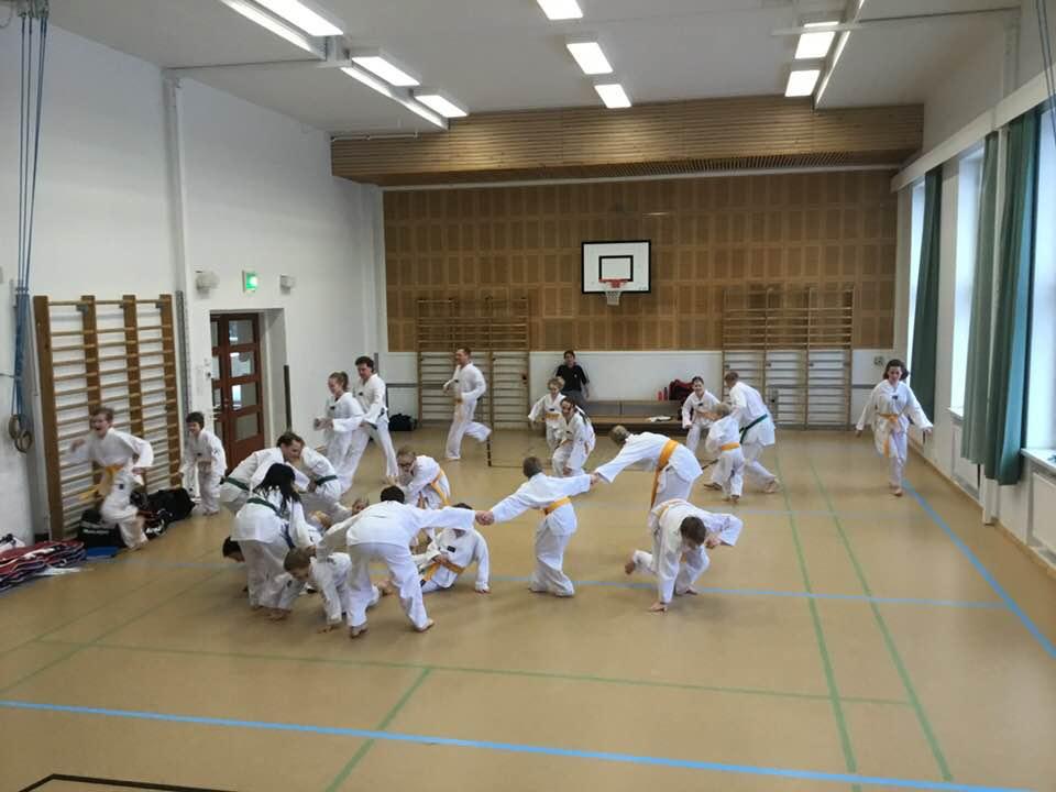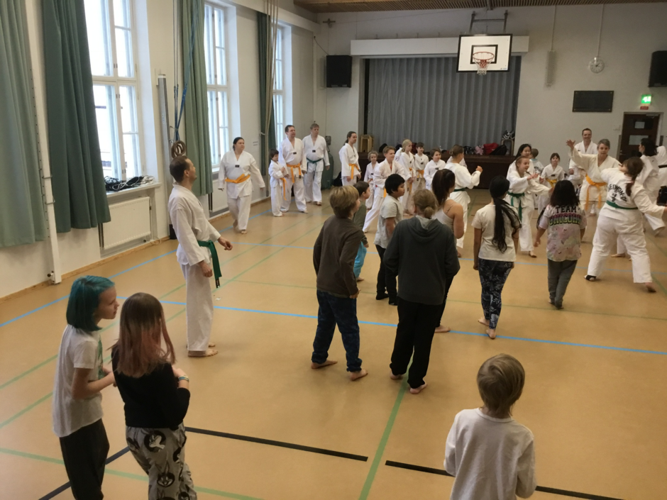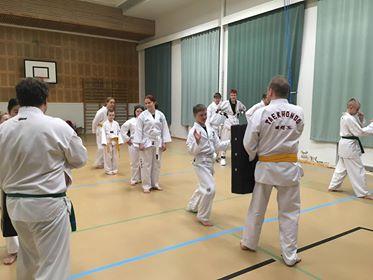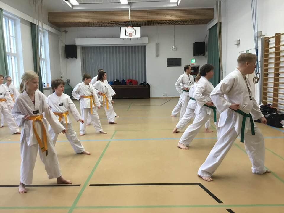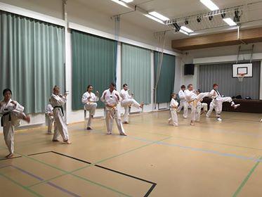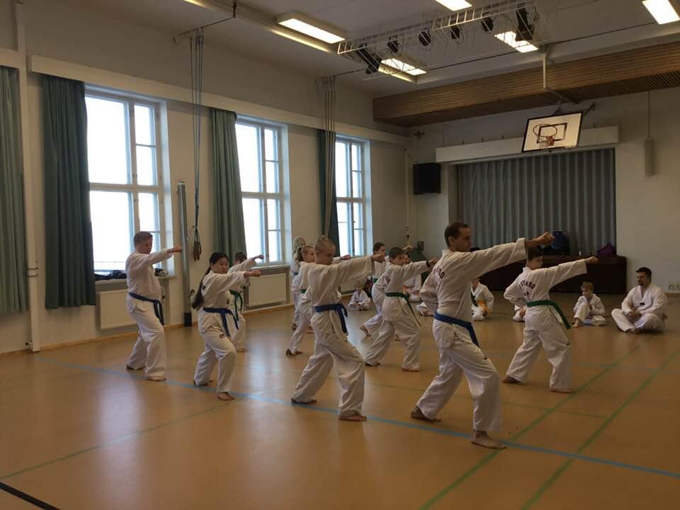 Jatkokurssilaisia ohjaajineen 4.11.2017, jolloin suoritettiin myös lasten harjoitusvyökoe aiheena taitopotkut ja -lyönnit.