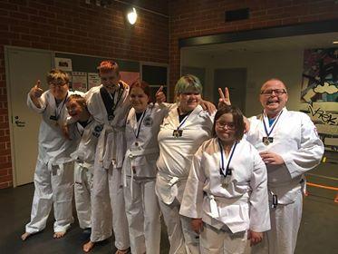 Taito- ja temppuradan Aktiivisuuskultamitalit kaulassa soveltavan taekwondon treeneissä 30.10.2018.