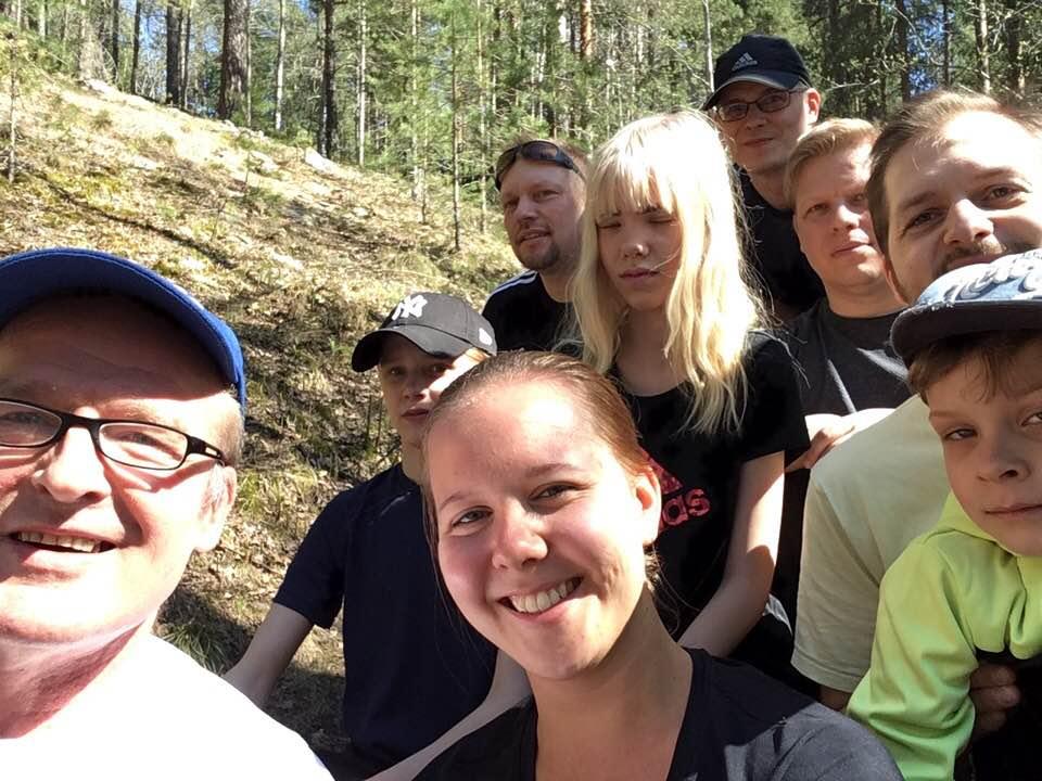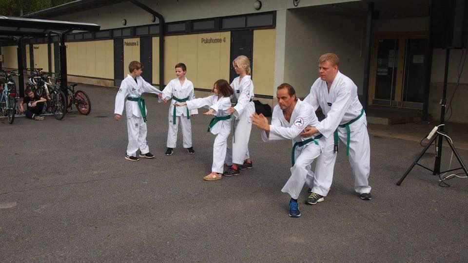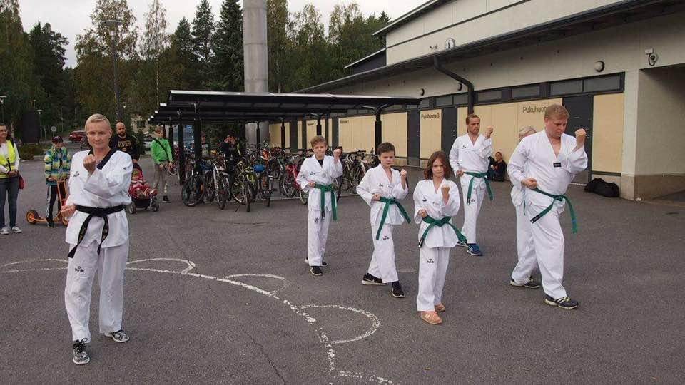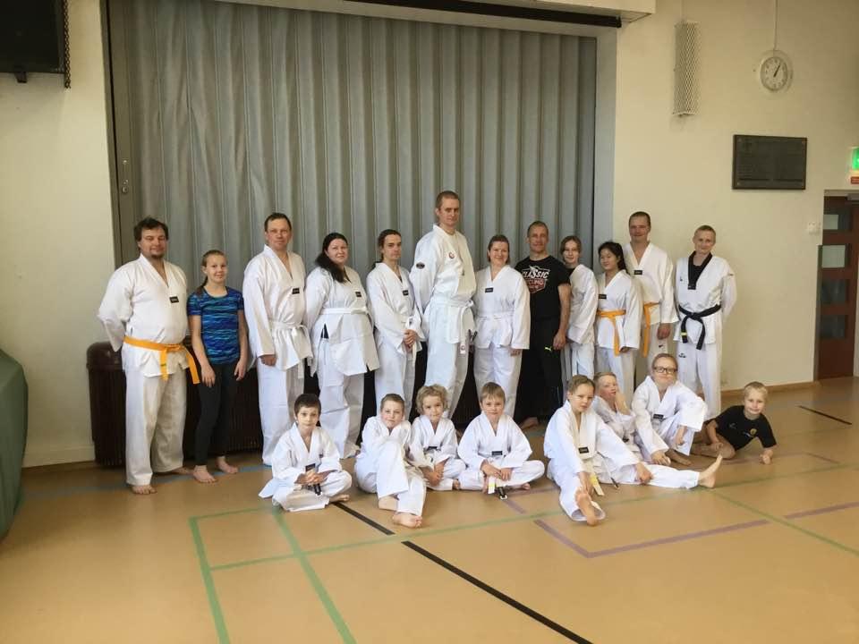 Suomen Taekwondoliiton perhevapaalla oleva pääsihteeri, Laura Ojala, 3.dan kuvan keskellä, pitämässä perhetreeniä SimUU-leirillä 20.5.2017. Aika hyvä edustus länkkyläisiä.
