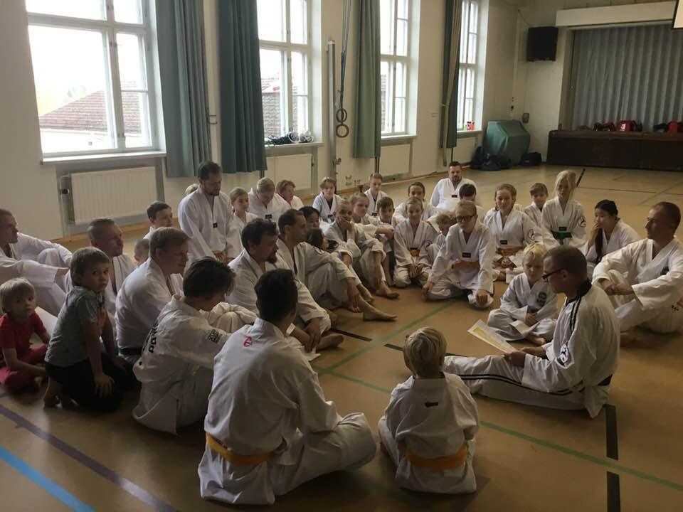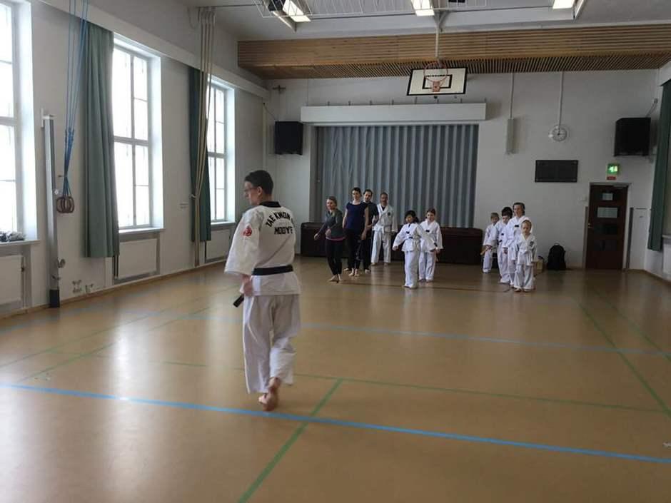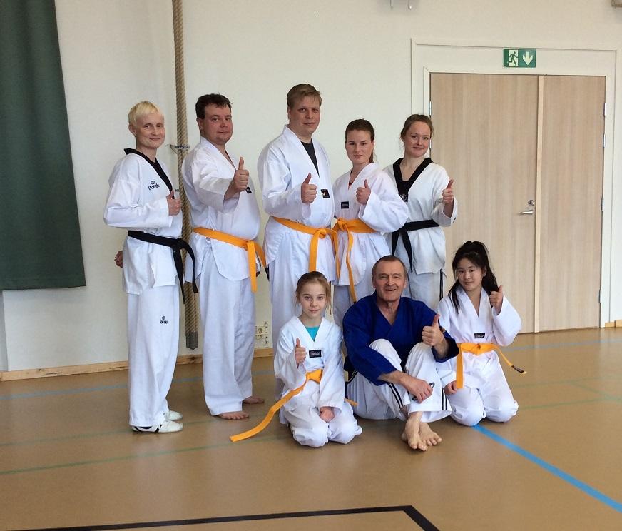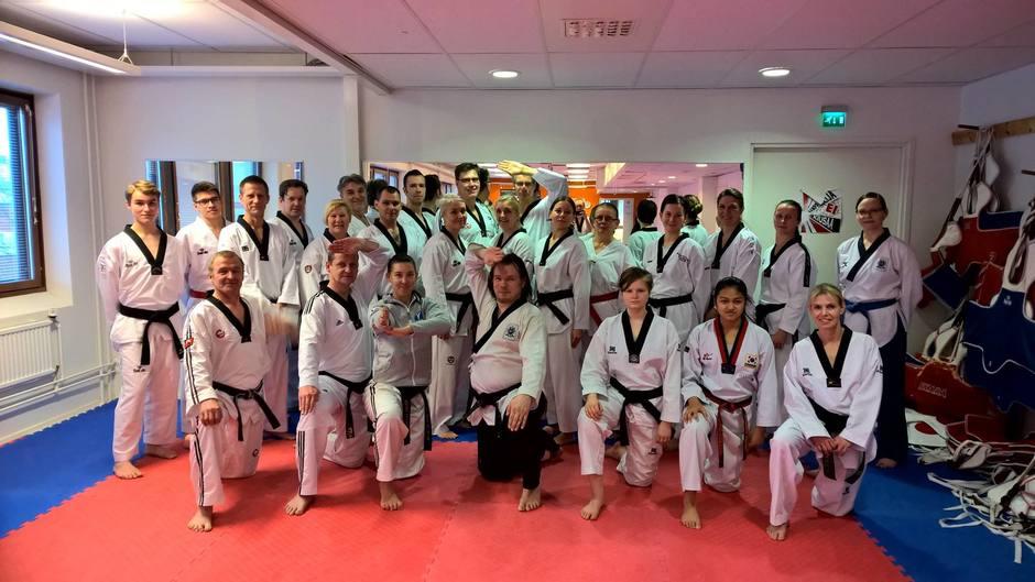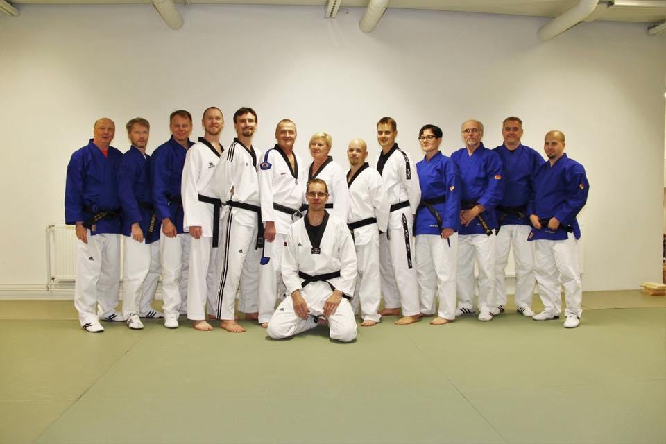 Sabumnim-koe Taekwondo Vihdin salilla 8.10.2016. Äärimmäisenä vasemmalla Esa Lappalaisen pääopettaja Marcos Kuusjärvi, 6.dan.