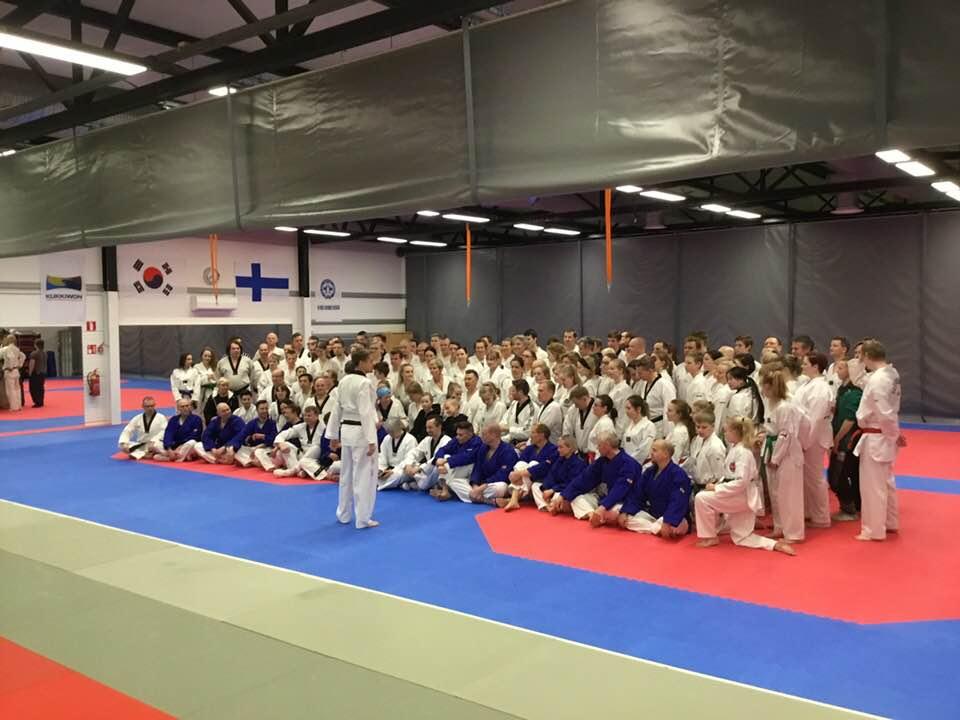SimUU-leirillä Vihdissä, 7.-8.4.2018, 180 harrastajaa mahtui treenaamaan juuri ja juuri Vihdin Taekwondoseuran ja Judoseuran yhdistettyyn saliin. Mahtavat kamppailupuitteet Vihdissä.