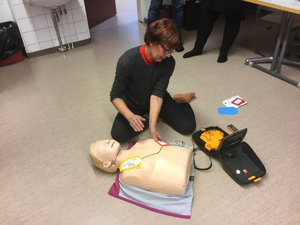 Sirpa opastaa defibrillaattorin käytöä 19.11.2017. Näitä alkaa löytymään jo useasta kauppakeskuksesta ja huoltoasemalta, ja niille koulutetut käyttäjät.