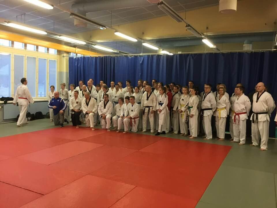 Ismo Hautalan, 5.dan, perinteisen tekniikan periaatteita -tapahtumaan 17.3.2018 osallistui yhteensä 38 harrastajaa. Jatkokurssi ja värivyöt laajakulmakuvassa, kun ei tavalliseen kuvaan mahtunut.