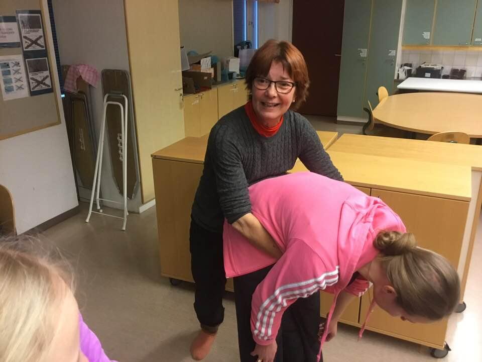 Sirpa Miettinen opettaa Heimlichin otteen käyttöä seuran puheenjohtaja Tarun kanssa 19.11.2017.