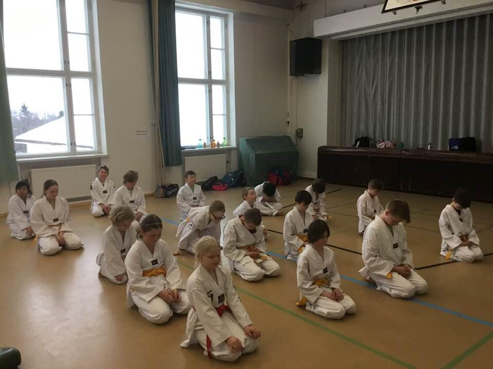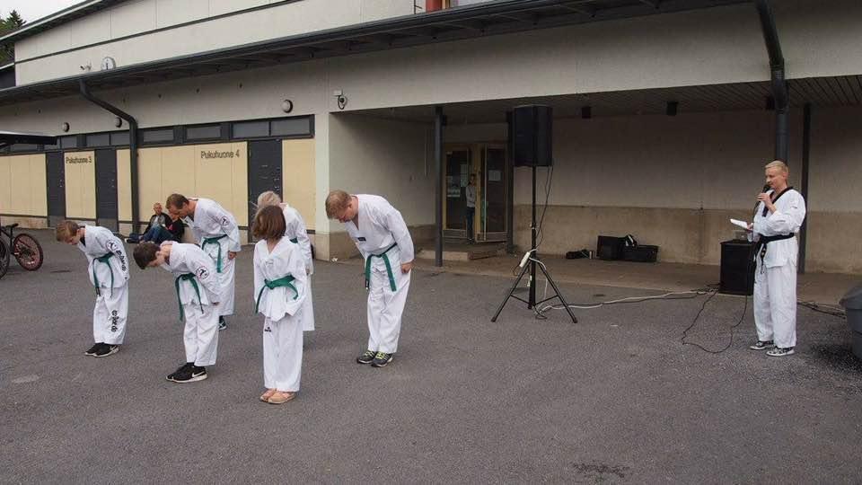 Kunnioitus on taekwondon tärkeä arvo, jota kumartamisella harjoitusparille osoitetaan (vyökoe 17.2.2018). Perhe-taekwondo parhaimmillaan on vanhempien ja lasten yhteinen harrastus, kuten Jukalla ja Siljalla.