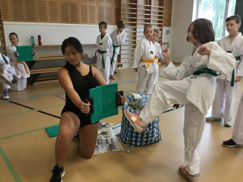 17.8.2017 pidettiin ensin lajiesittely uusille harrastajille ja perheen jäsenille, ja sen jälkeen potkutreenit. Taru näyttämässä kehäpotkua, mikä oli niin nopea, että kamerakaan ei ehtinyt saamaan potkaisevaa jalkaa kuvaan mukaan.
